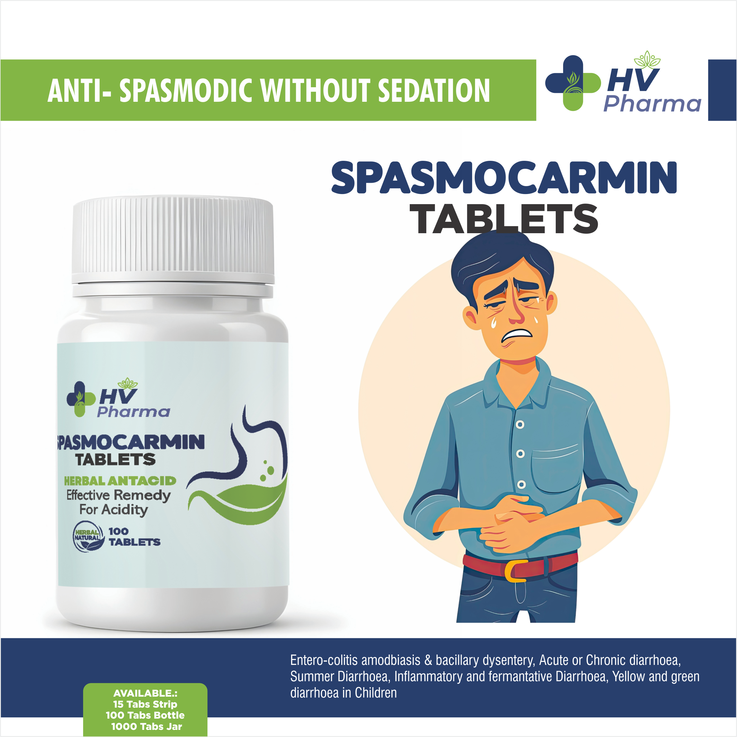 Spasmocarmin Tablets from HV Pharma are a safe anti-spasmodic remedy without sedation. They are specially formulated to relieve stomach cramps, diarrhoea, dysentery, and intestinal discomfort caused by infections or indigestion.